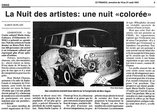 - Présentation à la Cité Francophone d'Edmonton des spectacles de Daniel Bélanger, le 30 octobre 1997, de Marie-Jo Thério, le 26 novembre 1997, et d'Angèle Arsenault, le 27 février 1998.