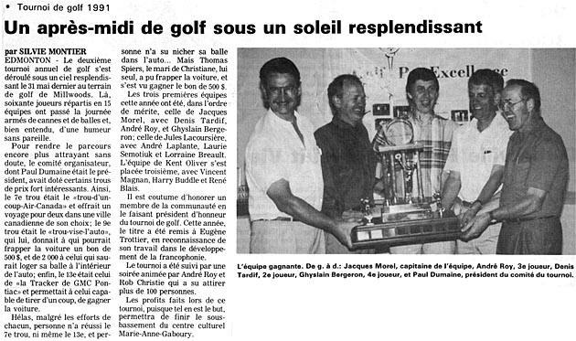 - Golf par excellence. Ce tournoi de golf est une initiative du Centre culturel Marie-Anne-Gaboury et aujourd'hui sert à récolter des fonds pour diverses organisations d'Edmonton. Les profits faits lors du tournoi de 1991 ont permis au Centre de terminer la rénovation de son sous-bassement.